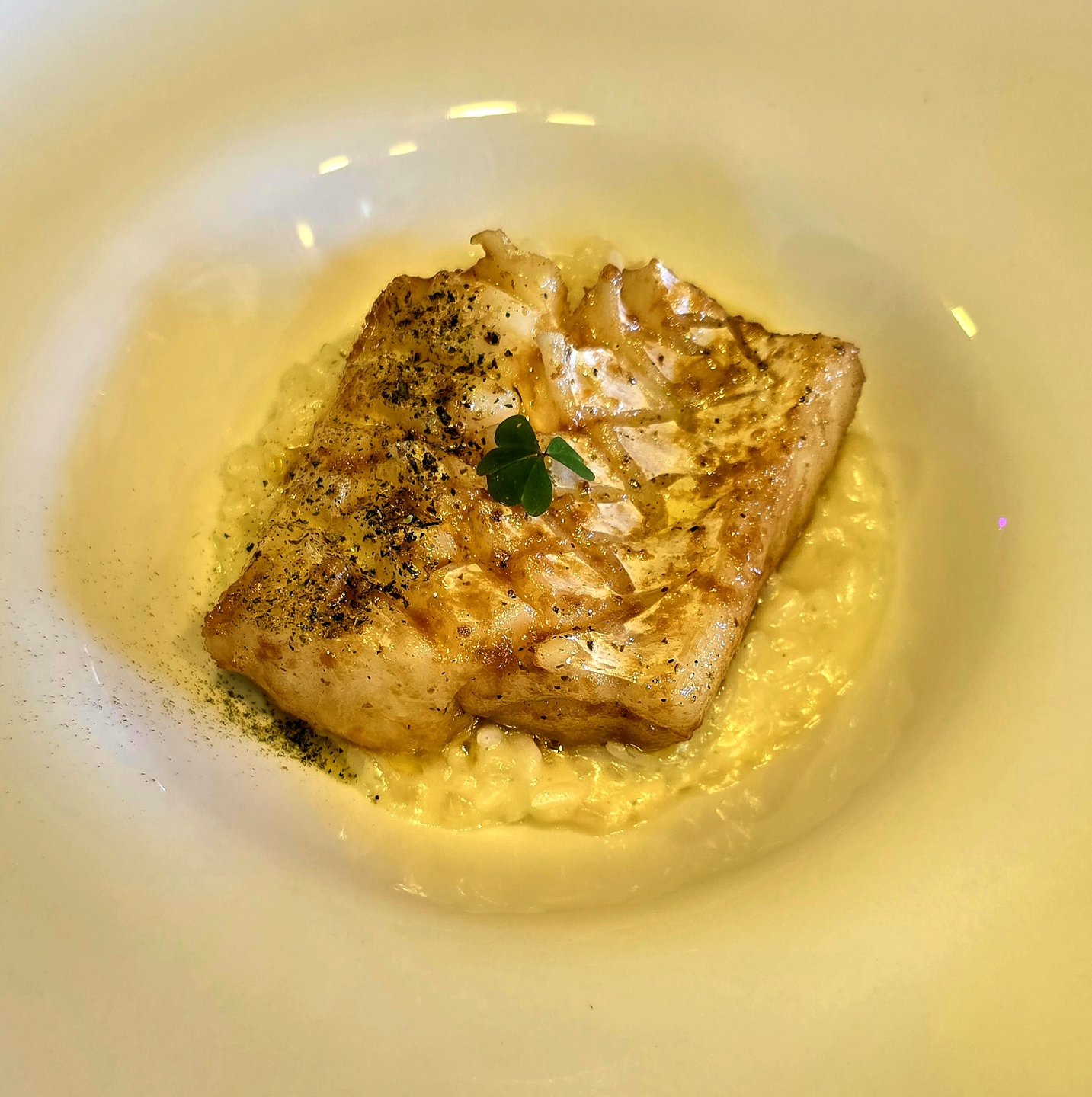 Sexto tiempo: Congrio al pilpil, servido sobre un risotto de pera y queso azul, una combinación agridulce, potente y poco convencional.