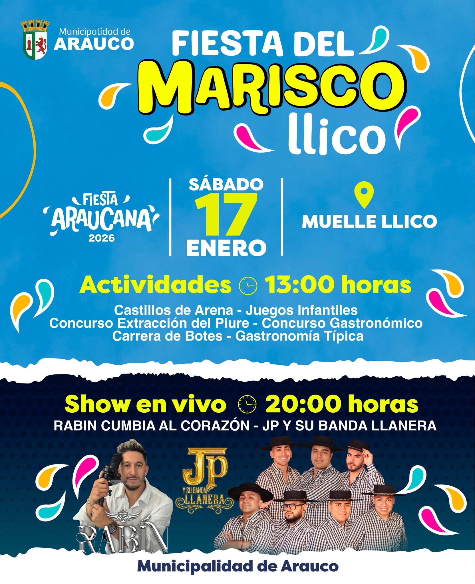 Fiesta del Marisco, actividad que se realizará el sábado 17 de enero, a partir de las 13:00 horas, en el Muelle de Llico y la Fiesta del Carapacho, actividad que se desarrollará el domingo 18 de enero en la localidad costera de Punta Lavapié